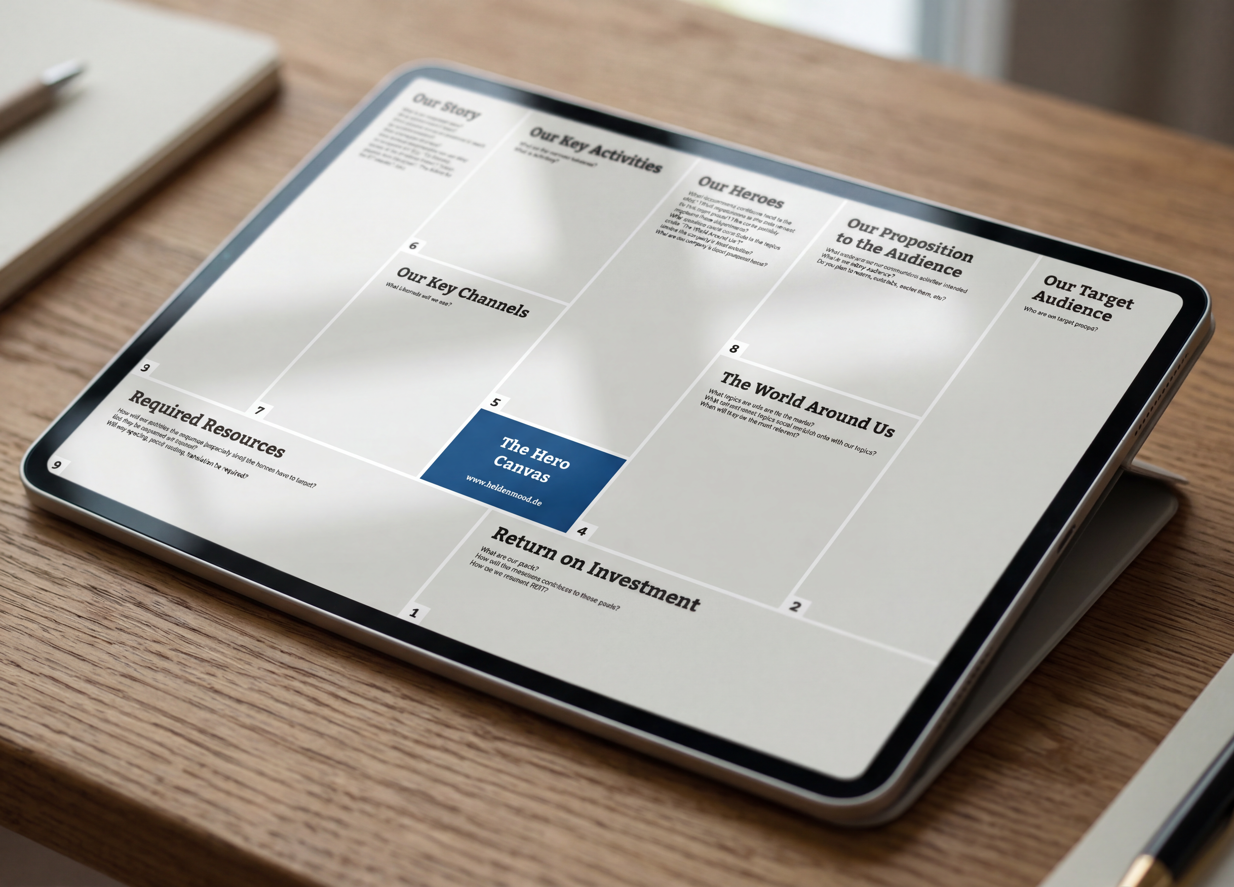 Ein strukturiertes Gespräch von zwei bis drei Stunden. Wir arbeiten uns durch neun Felder: Von den Zielen über die Zielgruppen bis zu den Botschaften und Ressourcen. Das Ergebnis ist der befüllte Hero Canvas.